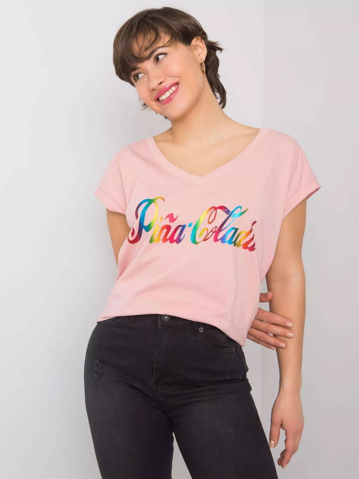 Tricou roz murdar cu imprimeu colorat.