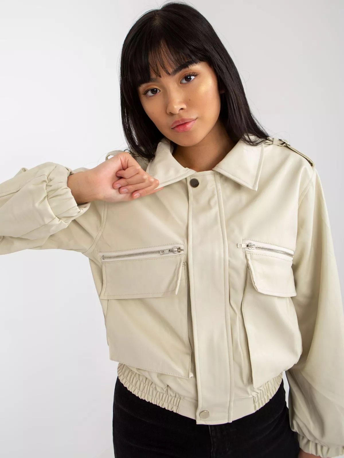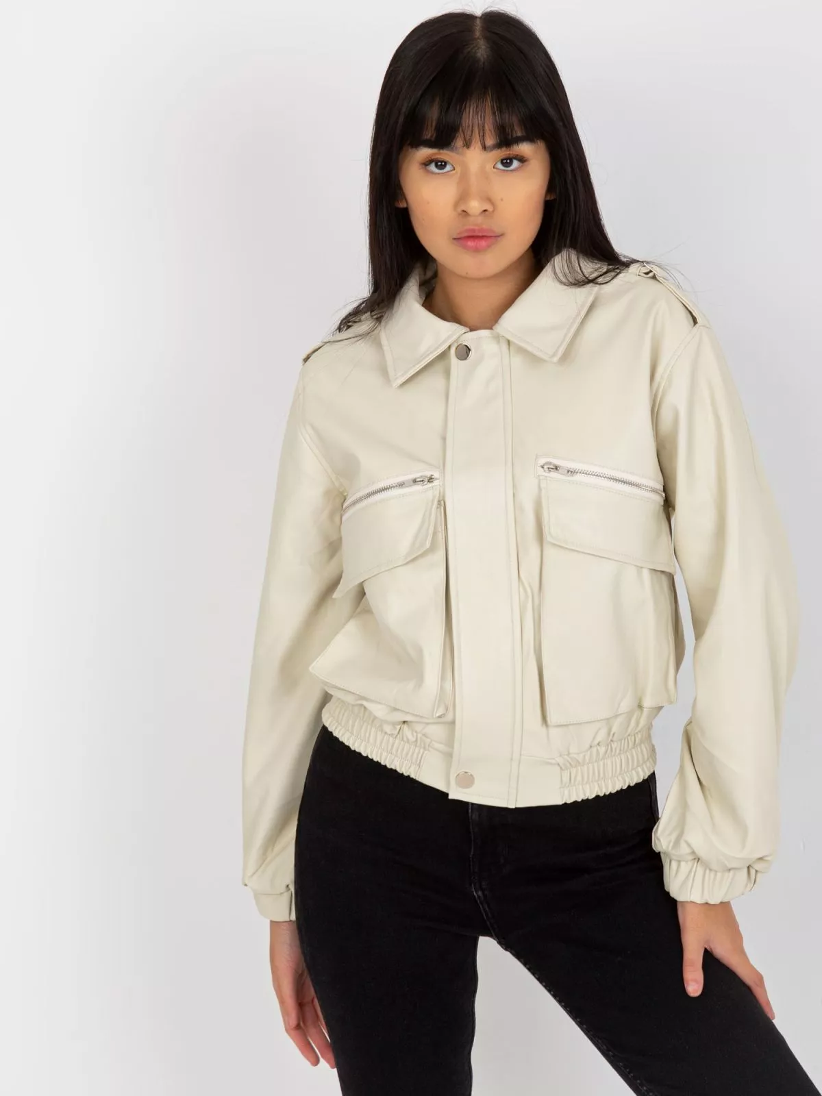 Jacheta scurta din piele ecologica de culoare bej deschis, cu guler.