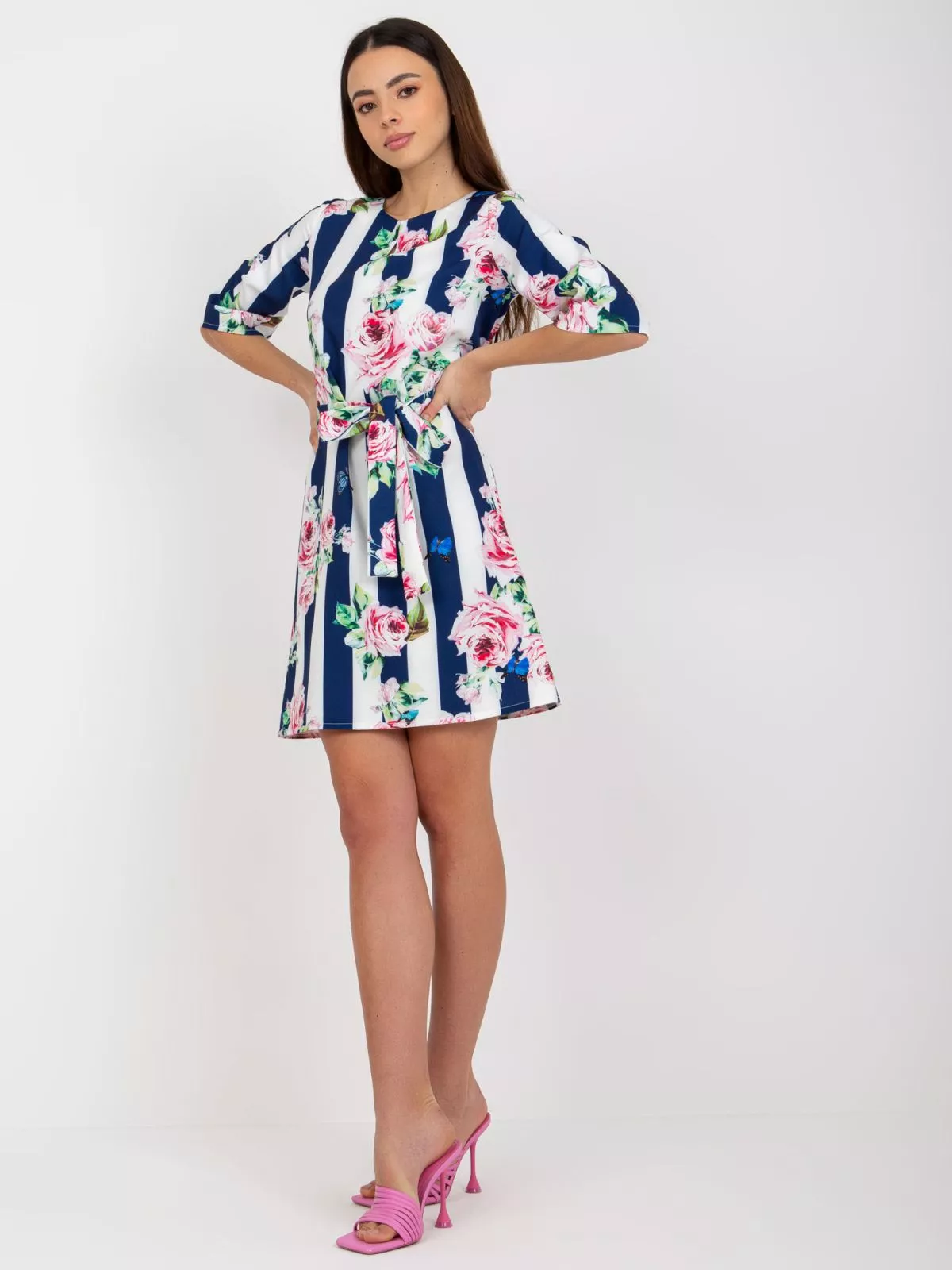 Dimensiuni model: inaltime 175 cm, bust 84 cm, talie 61 cm, solduri 91 cm.