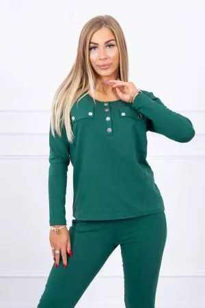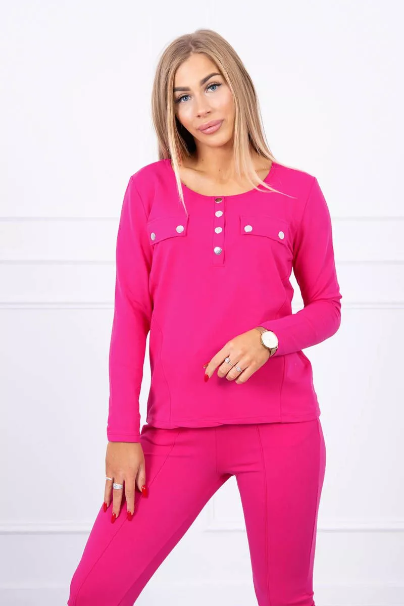 Prezentujemy PaAstwu komplet bluzki i spodni. Bluzka posiada zapiAcie w dekolcie na napy. Spodnie z kieszeniami i wiAzaniem w pasie. Komplet wykonany jest z wysokiej jakoAci materiaAu. Rozmiar jest uniwersalny i bAdzie odpowiedni dla PaA w rozmiarze S, M lub L.