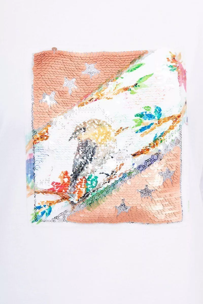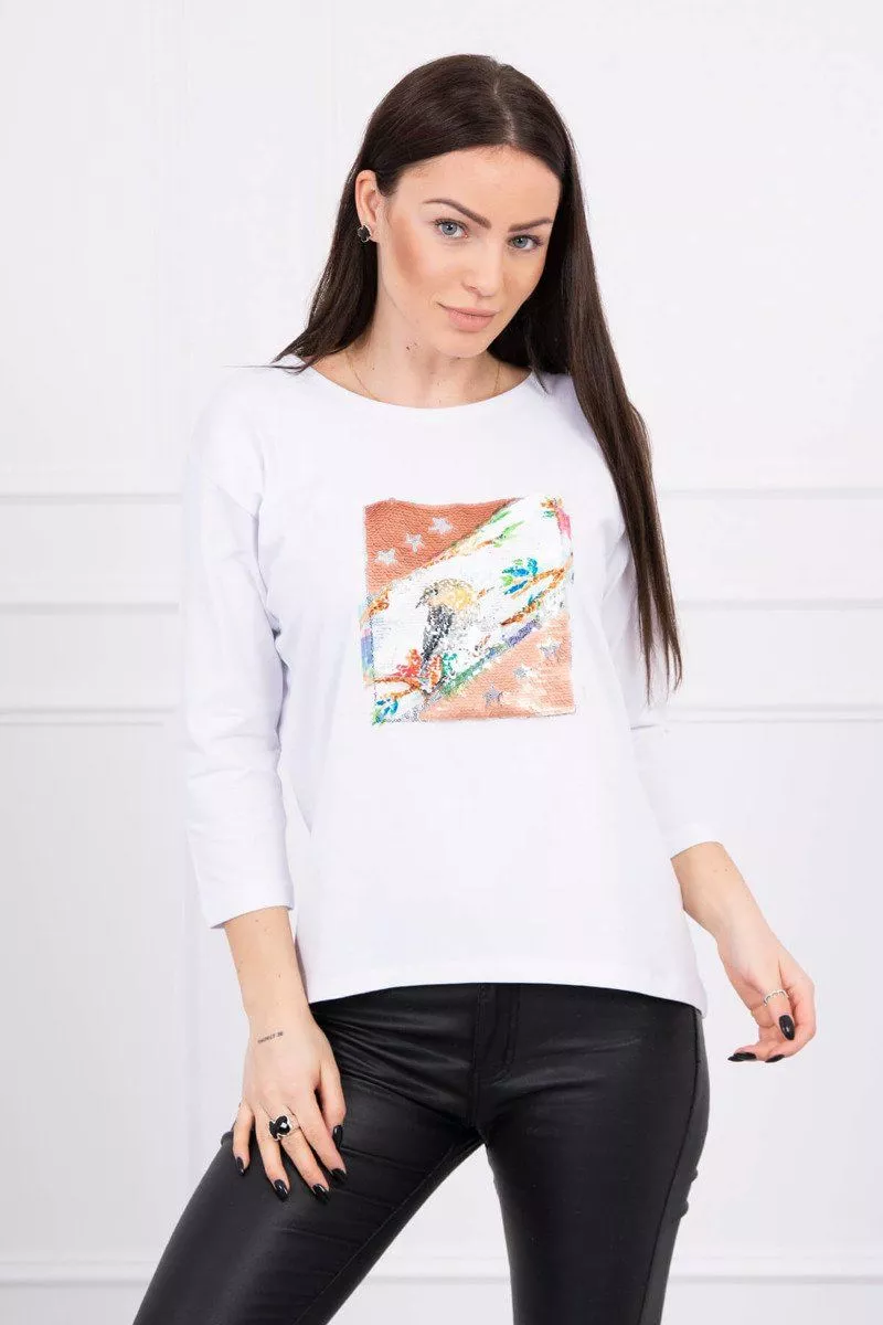 Prezentujemy PaAstwu modnA bluzkA. BluzkaAAposiadaAAnaszytA grafikA z przodu wykonanA z cekinAAw. Idealna propozycja na co dzieA. Bluzka wykonana jest z wysokiej jakoAci materiaAu. Rozmiar jest uniwersalny i bAdzie odpowiedni dla PaA noszAcych rozmiar M, L lub XL.