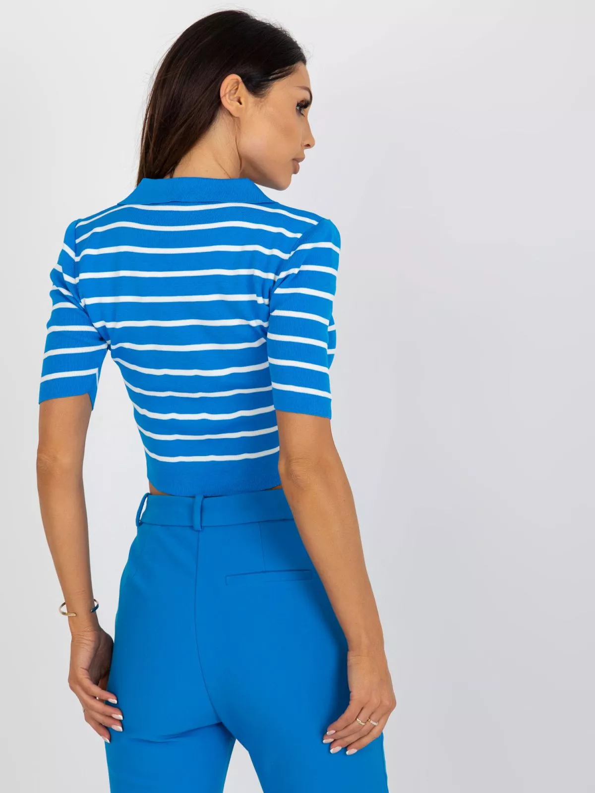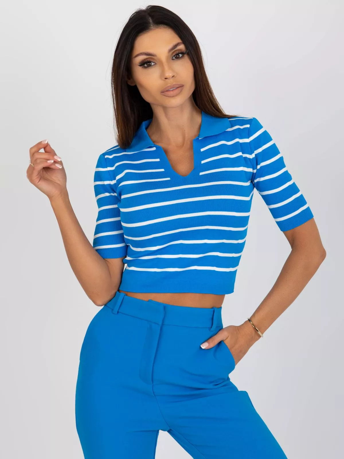 Bluza polo de dama albastra cu dungi.