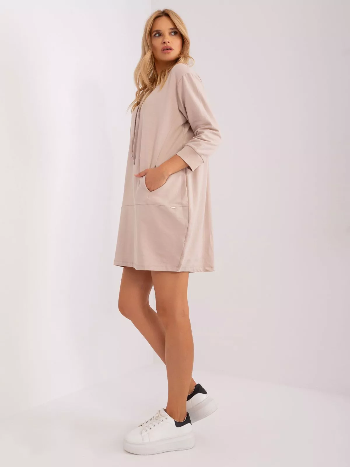 Rochie hanorac largi, bej, cu buzunare.
