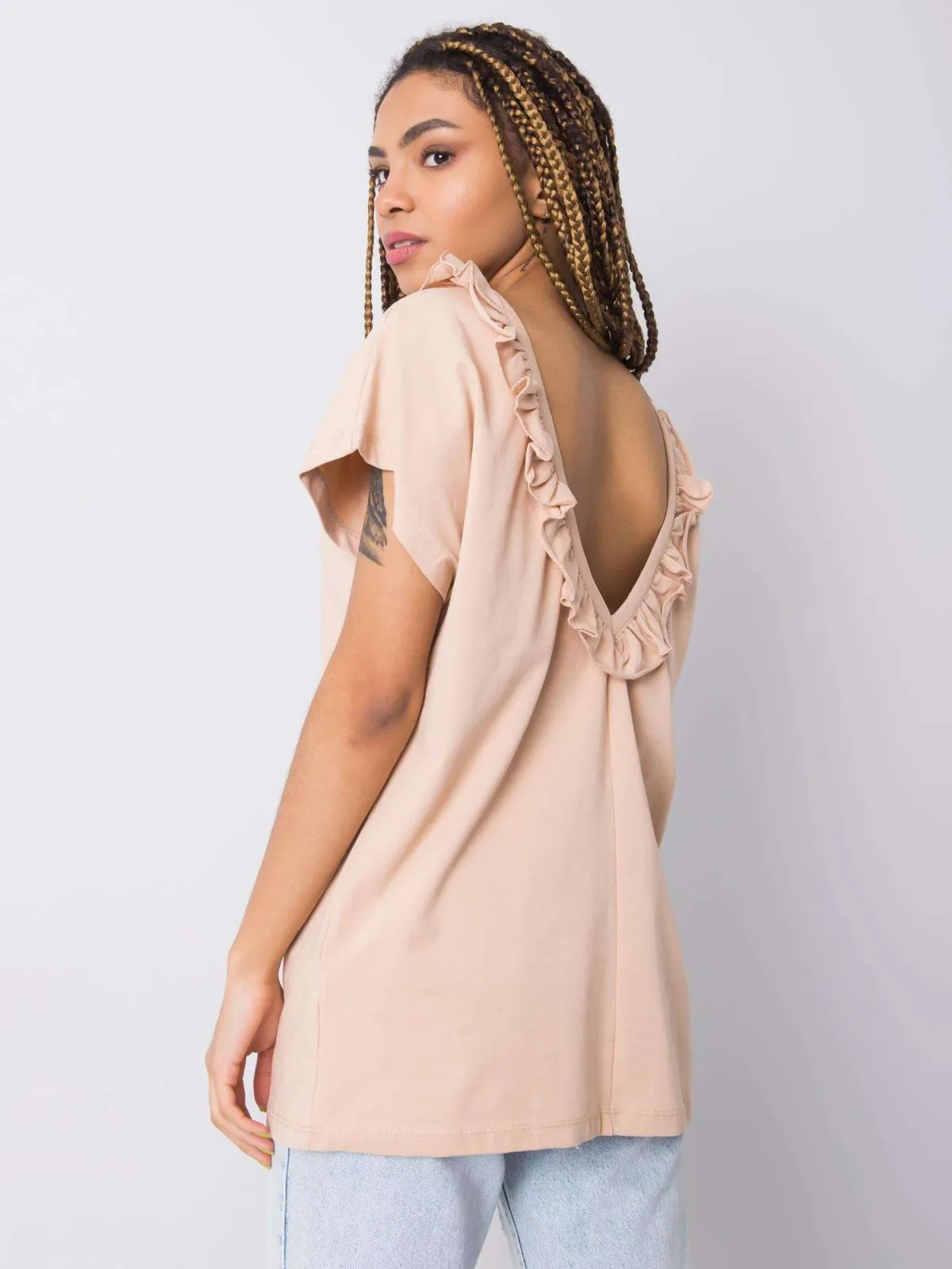 Bluza bej cu decolteu pe spate.