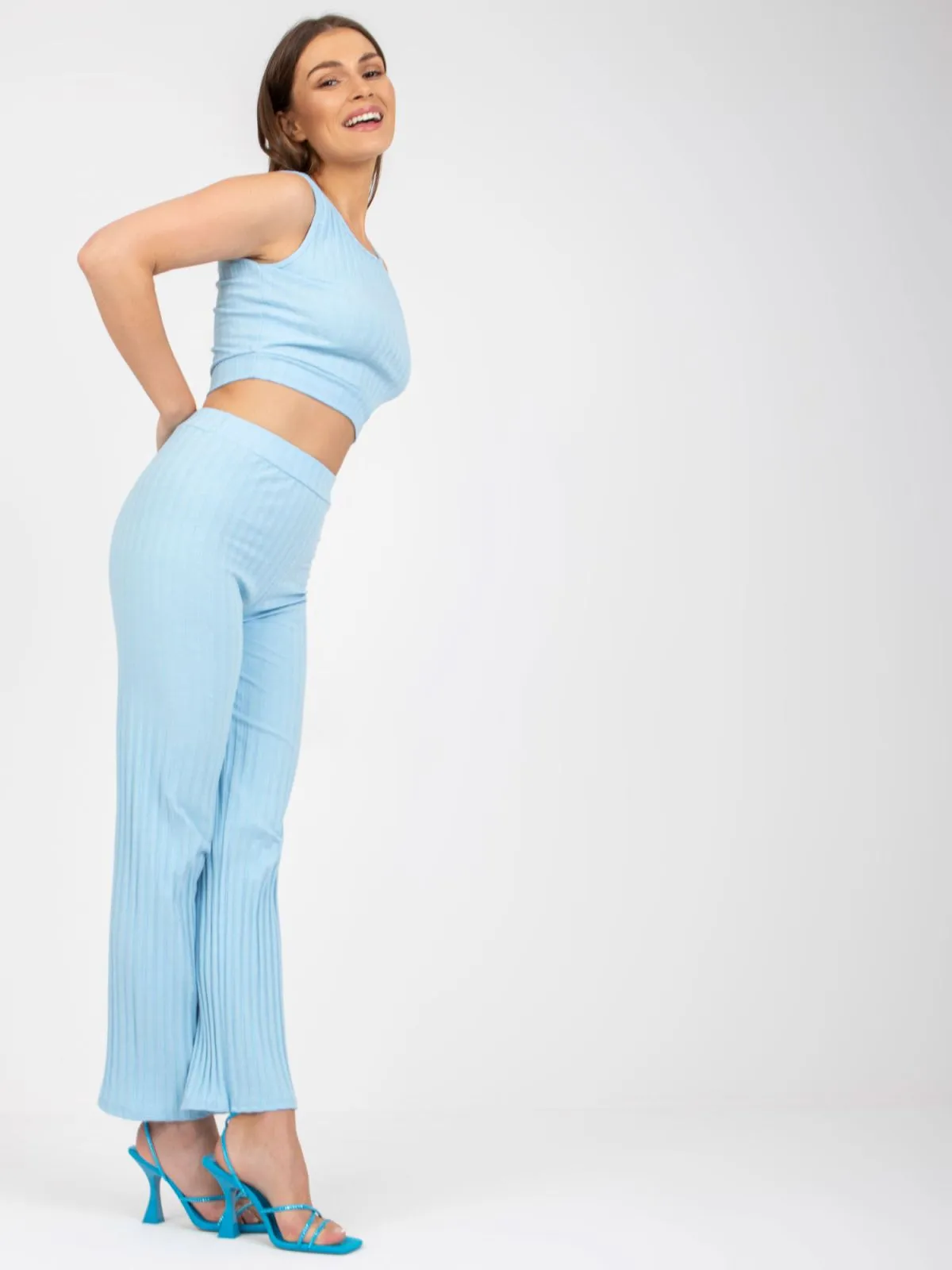 Dimensiunile setului in marime unica, masurate plat: latimea topului sub brate - 39 cm, lungimea topului - 41 cm, latimea pantalonilor in talie - 35 cm, inaltimea taliei - 29 cm, lungimea pantalonilor - 97 cm.