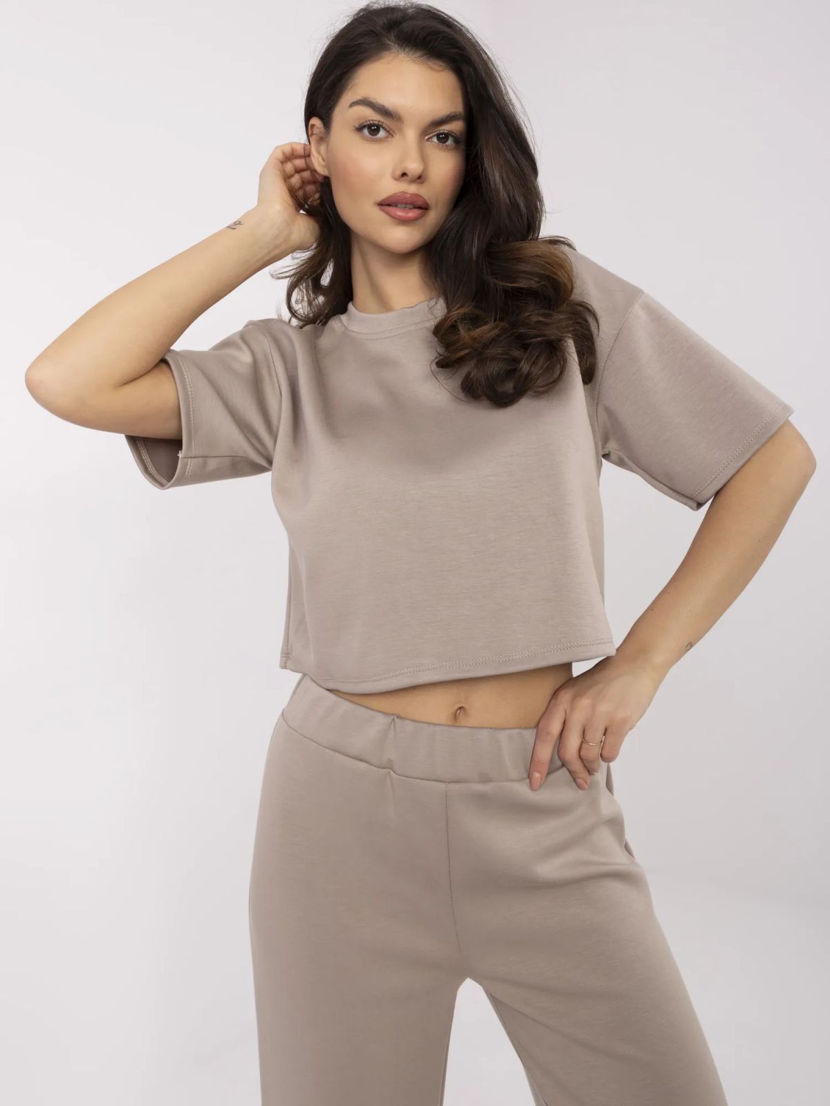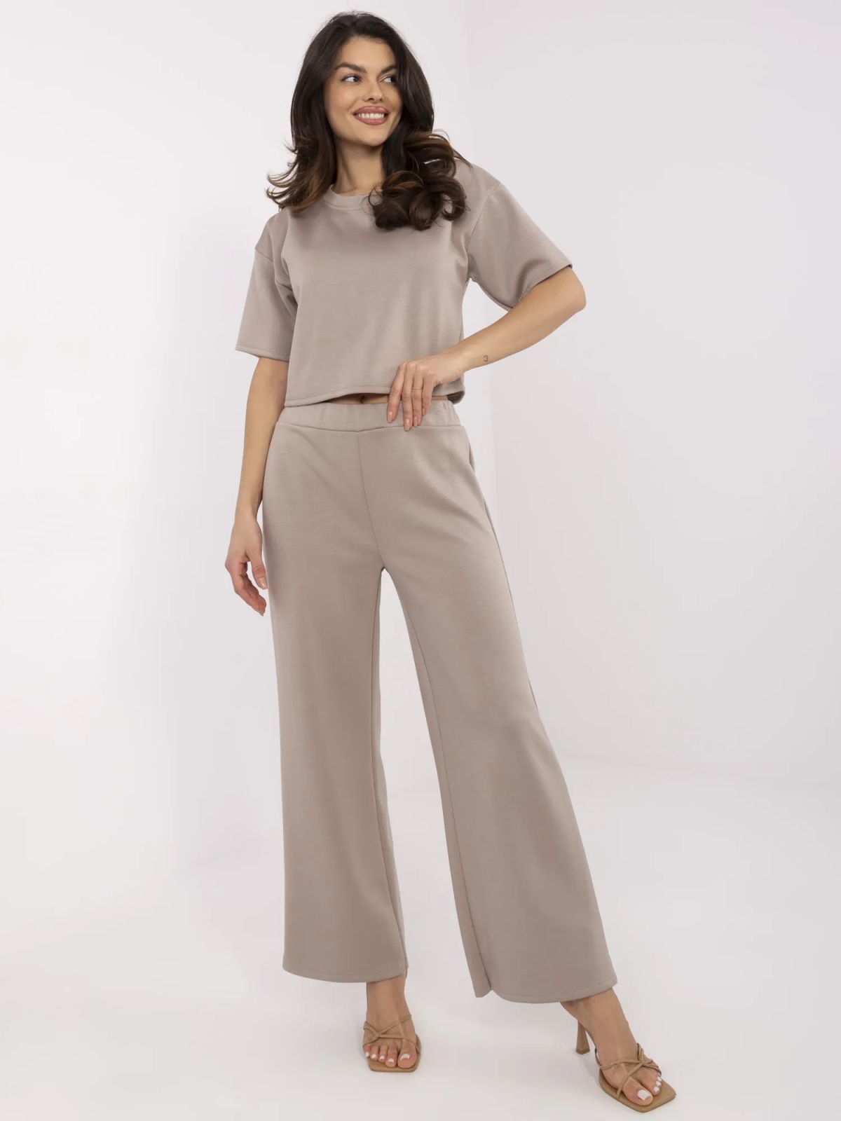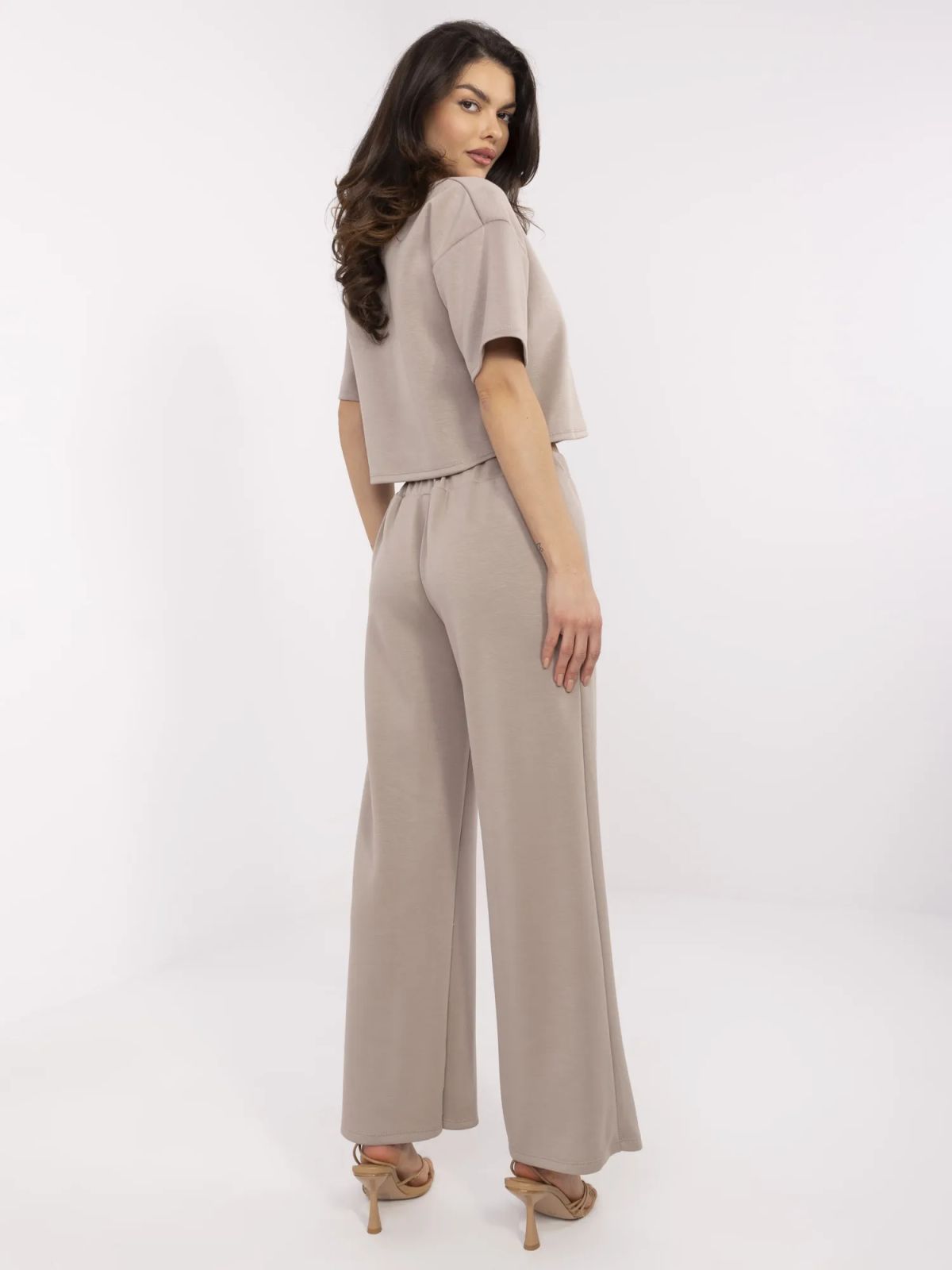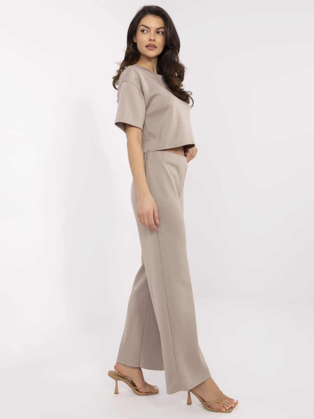 Dimensiunile setului intr-o singura marime: latime bluza sub brate - 49 cm, lungime maneca - 21 cm (de la cusatura), lungime totala - 46 cm, latimea pantalonilor in talie - 35 cm (plata), latimea pantalonilor in talie - 58 cm (atunci cand este intinsa), inaltimea taliei - 31 cm, latimea pantalonilor la solduri - 53 cm, lungime pantaloni - 101 cm.