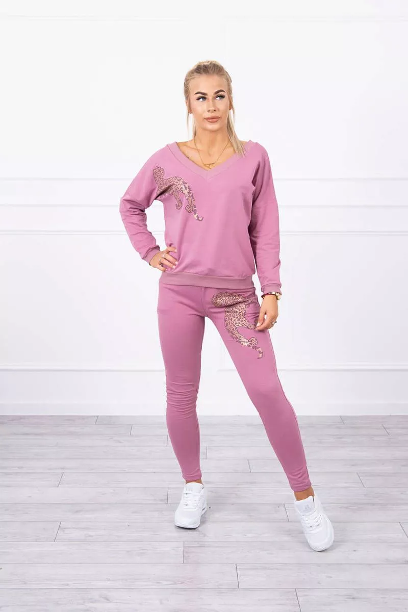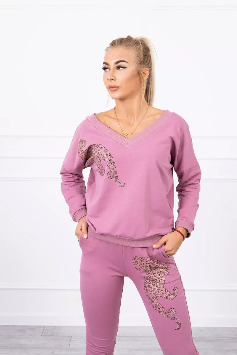Prezentujemy PaAstwu komplet bluzy i spodni. Bluza oraz spodnie posiadajA panterA z cyrkonii. Spodnie z kieszeniami i wiAzaniem w pasie. Bluza z dekoltem V. Komplet wykonany jest z wysokiej jakoAci materiaAu. Rozmiar jest uniwersalny i bAdzie odpowiedni dla PaA w rozmiarze S, M lub L.