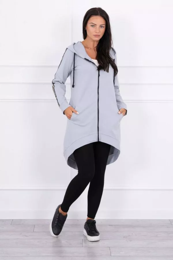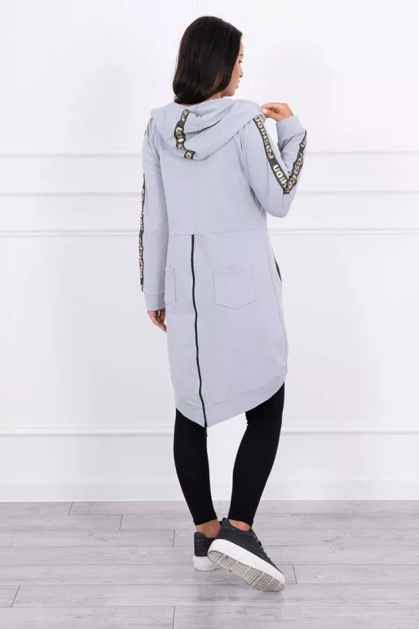 Va prezentam un hanorac lung confortabil. Hanoracul are fermoar si fermoar suplimentar la spate. Buzunare laterale si doua decoratiuni pe spate. Hanoracul are benzi cusute cu inscriptia fashion. Hanoracul este confectionat din material de inalta calitate. Marimea este universala si va fi potrivita pentru doamnele care poarta marimile S, M sau L.